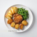 Sajtos, ízletes halétel, ropogós panírban, friss fűszerekkel tálalva.