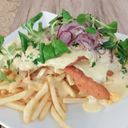 Szaftos csirkemell, cheddar sajttal, ropogós hasábburgonyával tálalva, ízletes és laktató étel.