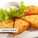 Sajtos, ízletes halétel, ropogós panírban, friss fűszerekkel tálalva.