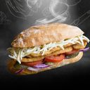 vekni, csirkemellfilé, reszelt füstölt sajt, csemegeuborka, hagyma, paradicsom