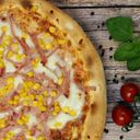 tomato pizza sauce, ham, mushrooms, corn, mozzarella cheese