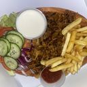 Hasábburgonya, jégsaláta, uborka, paradicsom, hús, joghurtos öntet,hagyma