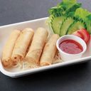 rizstészta lapba tekert tavaszi tekercs frissen sütve káposztával, üvegtésztával, répával, csirkehússal, édes chili szósszal (allergének: tej, szója, glutén)