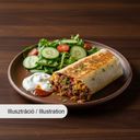 Slow-roasted pulled ancho beef in chili sauce, with cheese, vegetables, rice, beans, sour cream and fresh salad