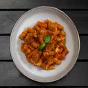 Homemade durum flour fusilli, old-school tomato sauce, chicken, tomatoes, olive oil, garlic, red wine, fresh oregano, parmesan, butter, mozzarella, fresh basil