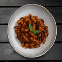 Homemade durum flour fusilli, beef and pork ragu, red wine, tomato, carrot, oregano, grated cheese, fresh basil
