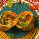 tortillachips, garnéla, mexikói feketebab, kukorica, salsa, sajt, lilahagyma, cheddar sajtszósz, jalapeno, fűszeres tejföl