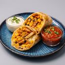 tortillába tekert tortilla, rizs, feketebab, kukorica, sajt, külön salsa + fokhagymás tejföl