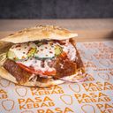 borjúhús, házi készítésű pita, saláta, káposzta, paradicsom, lila hagyma, uborka, kebabszósz, őrölt chili paprika (Kérlek, válassz hozzá hús mennyiséget, köretet, üdítőt!)