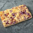 fokhagymás pizzatészta tejfölös alappal, kockázott baconnel, karikára szelt hagymával megszórva, trappista sajtttal