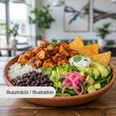 Mexikói ihletésű tálételek rizzsel, nachossal, babbal és friss zöldségekkel