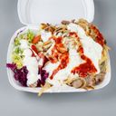 hús, lila káposzta, hagyma, saláta, paradicsom, joghurtos szósz, csípős szósz, hasábburgonya (kis adag), 1db 0,33l-es üdítő (Kérlek, válassz hozzá szószt és üdítőt!)
