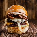 marhahús, baconszalonna, cheddar sajt, jégsaláta, paradicsom, lila hagyma, mayo, barbecue szósz