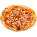 San Marzano paradicsomszósz D.O.P., mozarella, szalámi, kolbász, bacon, lilahagyma, hegyes erős paprika, csípős (allergének: glutén, tej)