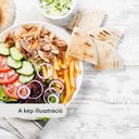 gyroshús, friss saláta, hasábburgonya, csípős szósz