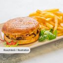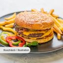 Kézműves buci, házi szósz, marha húspogácsa, omlett, karamellizált hagyma, cheddar sajt, bacon és savanyú uborka
